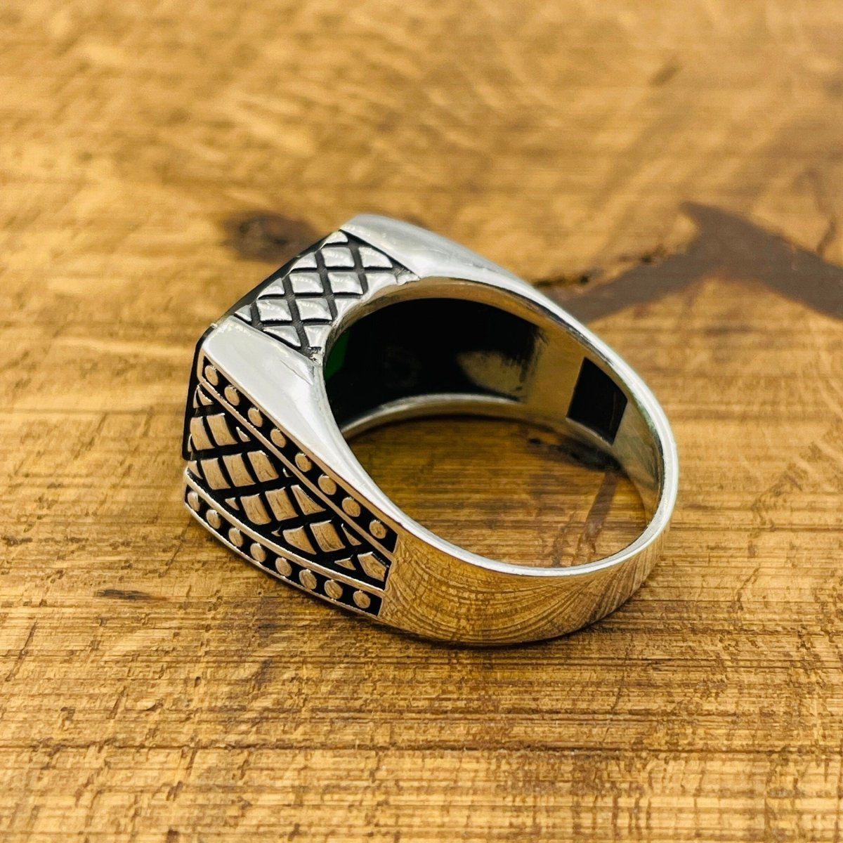 Mens Rectangle Green Zircon Stone Silver Ring - Turkish Handmade