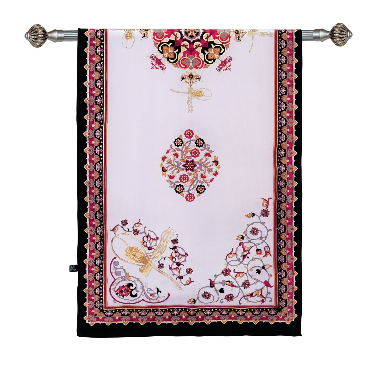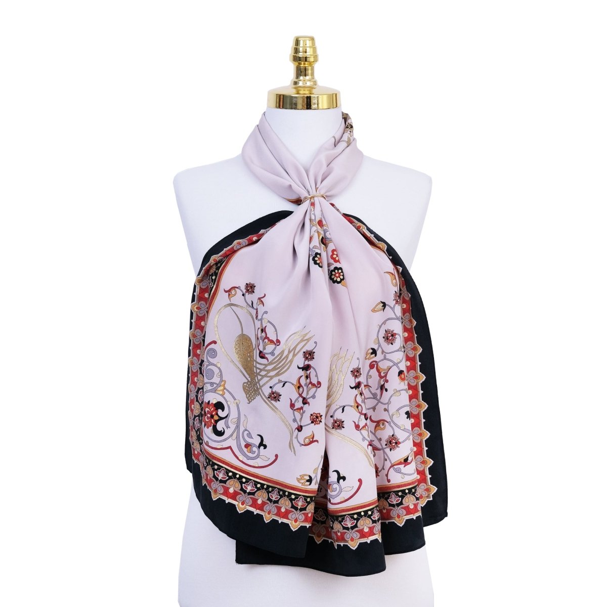 This exquisite black scarf with striking red designs is a timeless masterpiece crafted from 100% crepe silk, known for its luxurious texture and softness. Inspired by Ottoman design history, the intricate patterns are meticulously hand-pressed by skilled artisans, adding a tactile quality to its visual elegance, making it a sophisticated and refined accessory.
