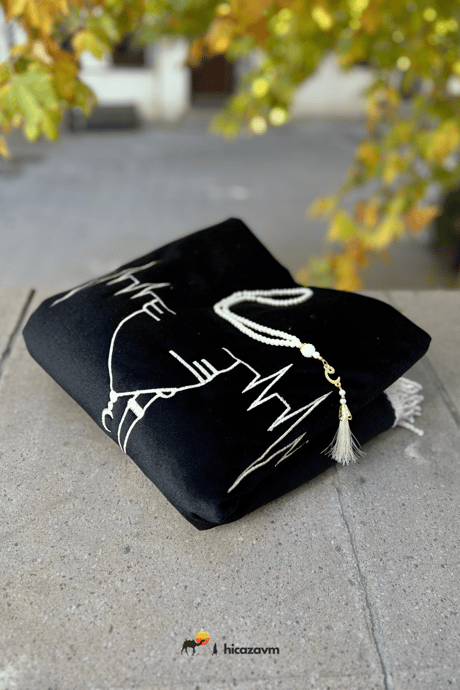Embrace elegance and tranquility with this black prayer rug adorned with gold embroidery. Experience utmost comfort and luxury during your peaceful prayers with this exquisite rug.