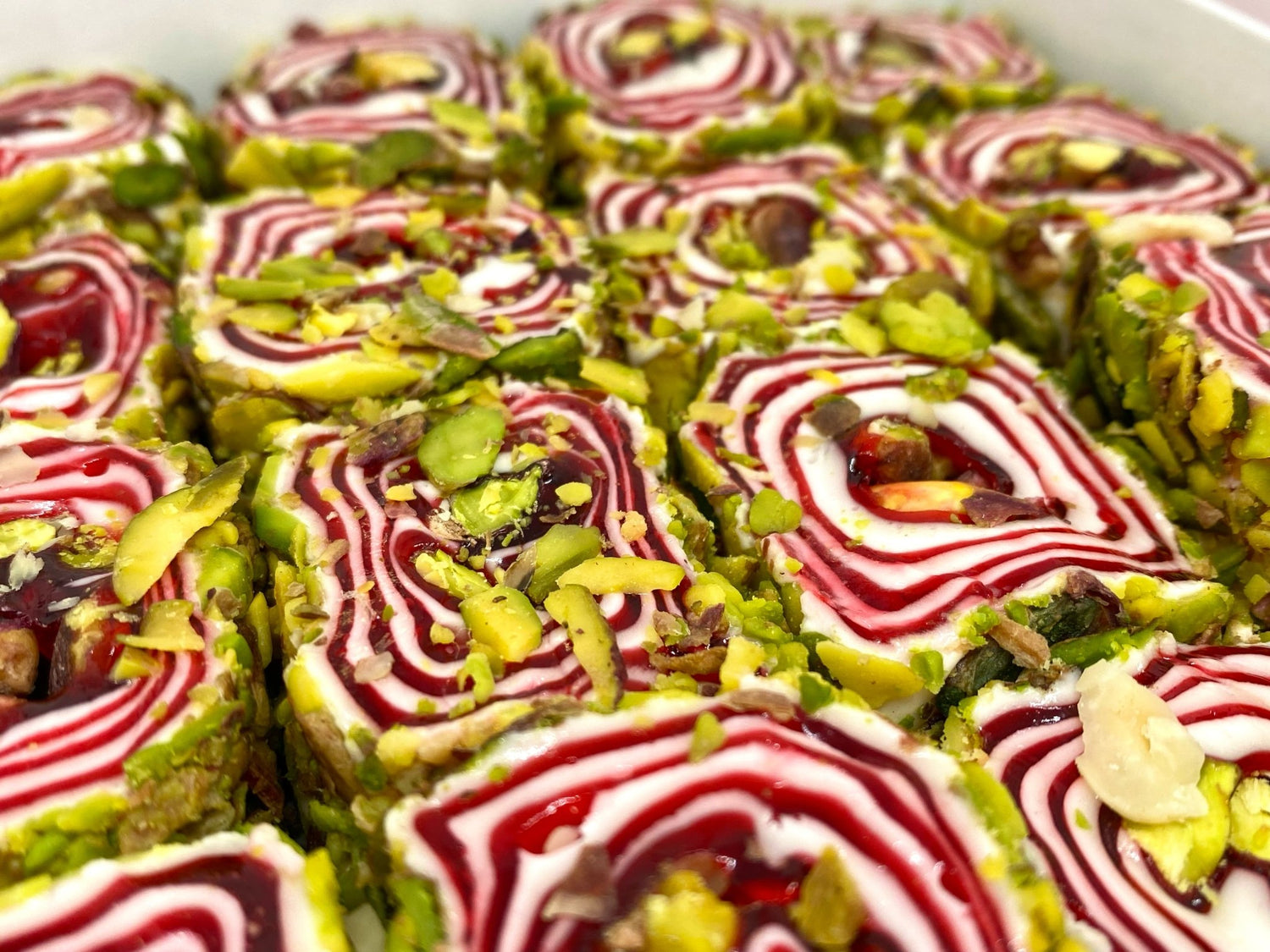 The Ottoman Wrap is one of Ganik Sarsultan's finest Turkish Delights. This variety is made of premium Antep pistachios layered in between a wick made of both a sweet fruity red layer and a white creamy nougat-like layer, with all the ingredients rolled into a wrap and covered with more chopped Antep pistachios. It's as delicious as it is visually stunning!