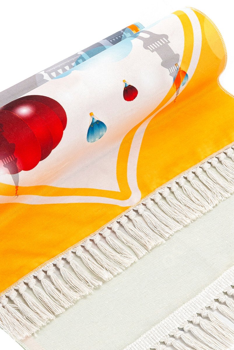 This digital printed children's prayer rug features engaging motifs of balloons, tractors, and mosques. Crafted from cotton, it offers a colorful and comfortable prayer experience for children with its soft texture and lightweight design.