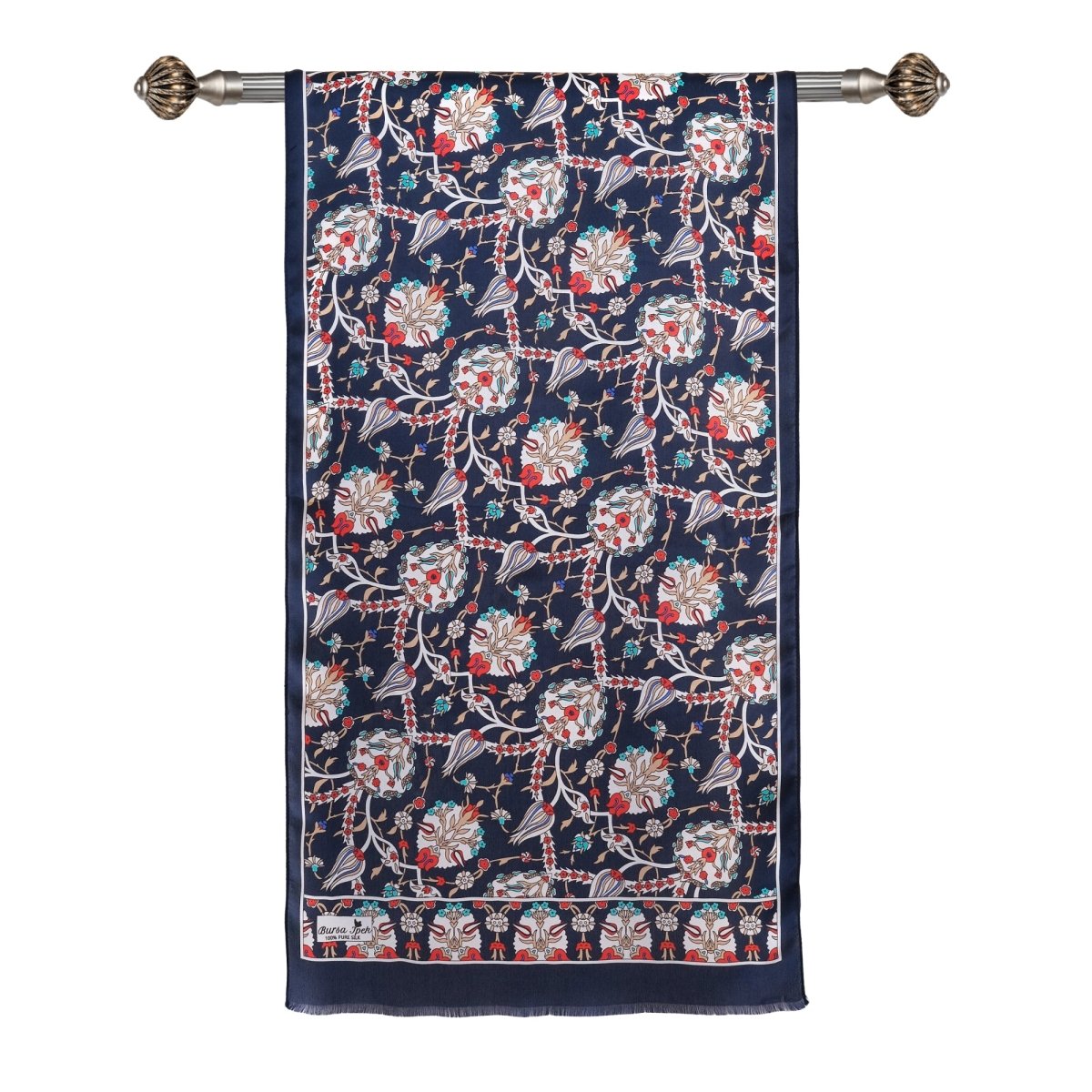 Drawing inspiration from artistic Lale patterns, this scarf weaves a captivating symphony of Black with accents of Orange, Turquoise, and Cream, showcasing contemporary sophistication.