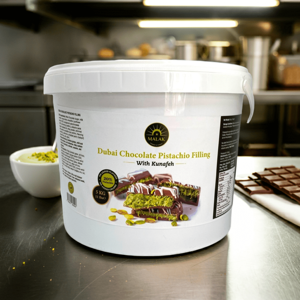 Bring a new level of indulgence to your dessert creations with Malak Dubai Chocolate Pistachio Filling with Kunafeh, a premium blend featuring 20% Antep pistachios and the traditional sweetness of kunafeh (kadayif). Designed for chocolatiers, boutique bakeries, and modern cafés, this ready-to-use filling combines creamy texture with a bold flavor profile that’s both nostalgic and innovative.
