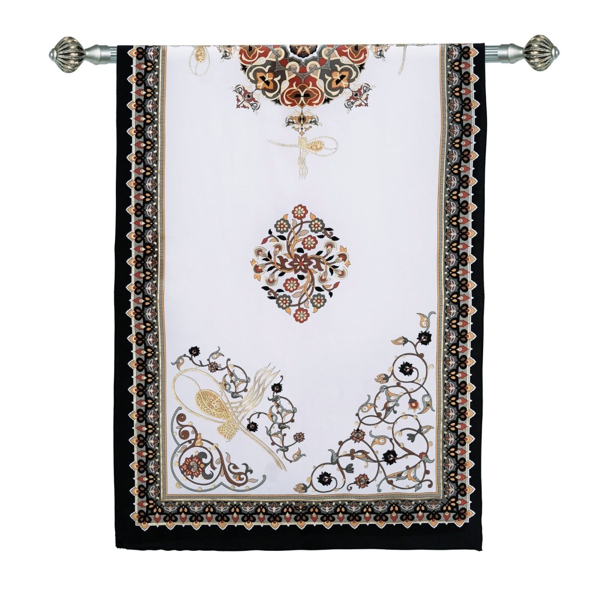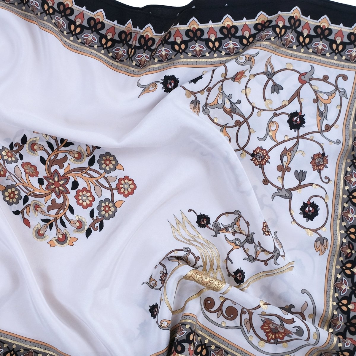 Elevate your style with our exquisite Tuğra Breathable Lightweight Scarf in stunning black. Made from 100% crepe silk, known for its luxurious texture and exceptional softness, this scarf embodies sophistication and elegance with intricate Ottoman-inspired designs that add timeless beauty to any outfit.